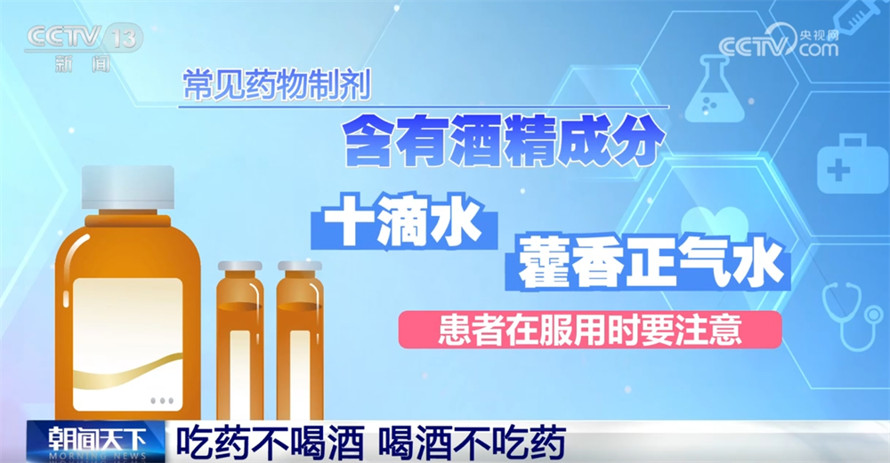 北京大学第三医院药学部副主任药师应颖秋称:“像甲硝唑、呋喃妥因、复方磺胺甲噁唑这样的抗生素,它和酒同服都可能会出现双硫仑样反应。感冒药跟酒精在一起合用之后,很容易发生溃疡或者是消化道出血,甚至会引起肝损,然后发生肝功能的异常、肝酶的升高。酒精也会影响胰岛素的代谢,它很可能会造成低血糖的情况。一些降压药本身是通过扩张我们的血管,酒精可能会产生这样的一个降压作用的叠加,使我们的血压就会降得更低,这个病人可能就会站不住。”