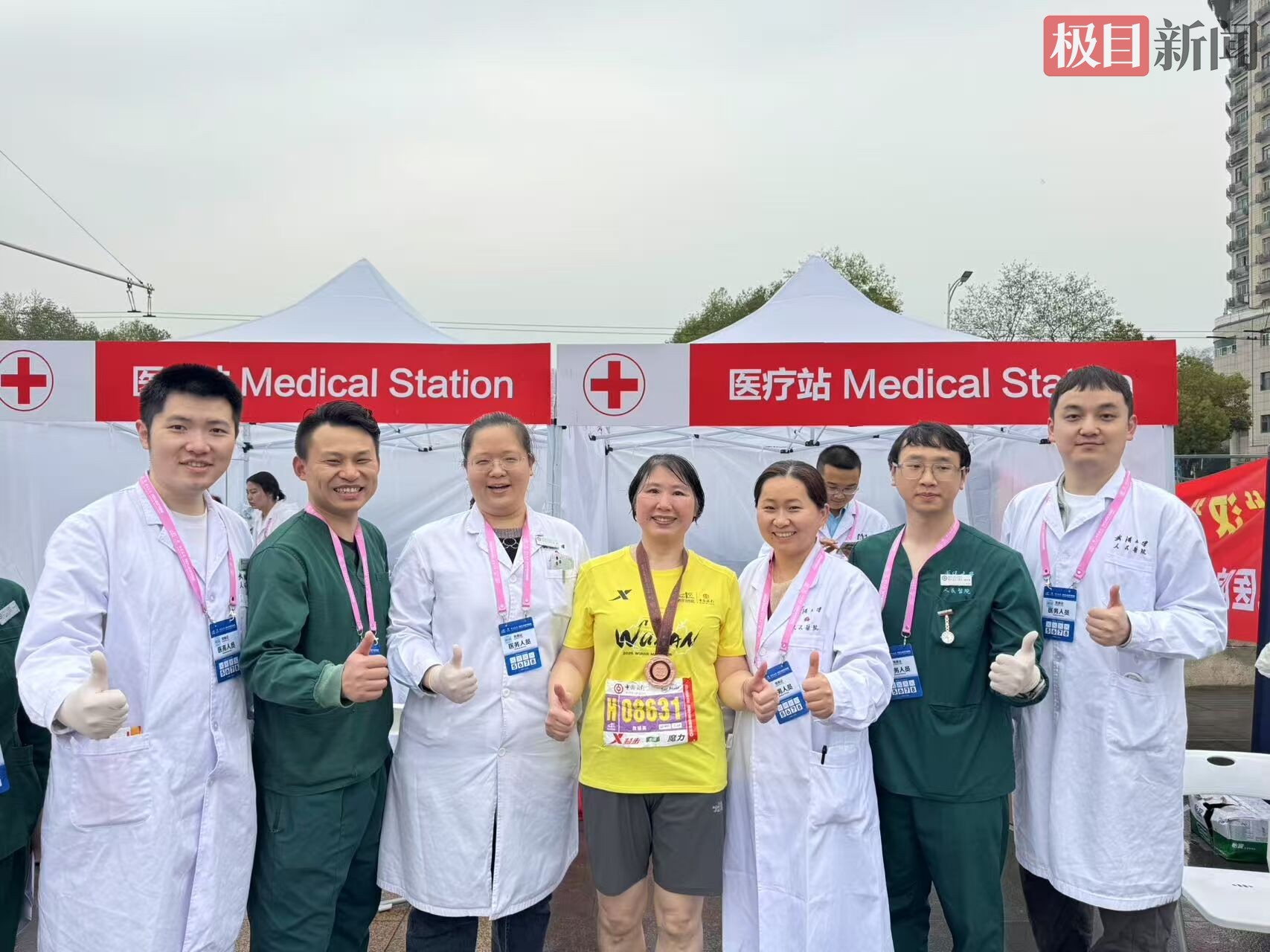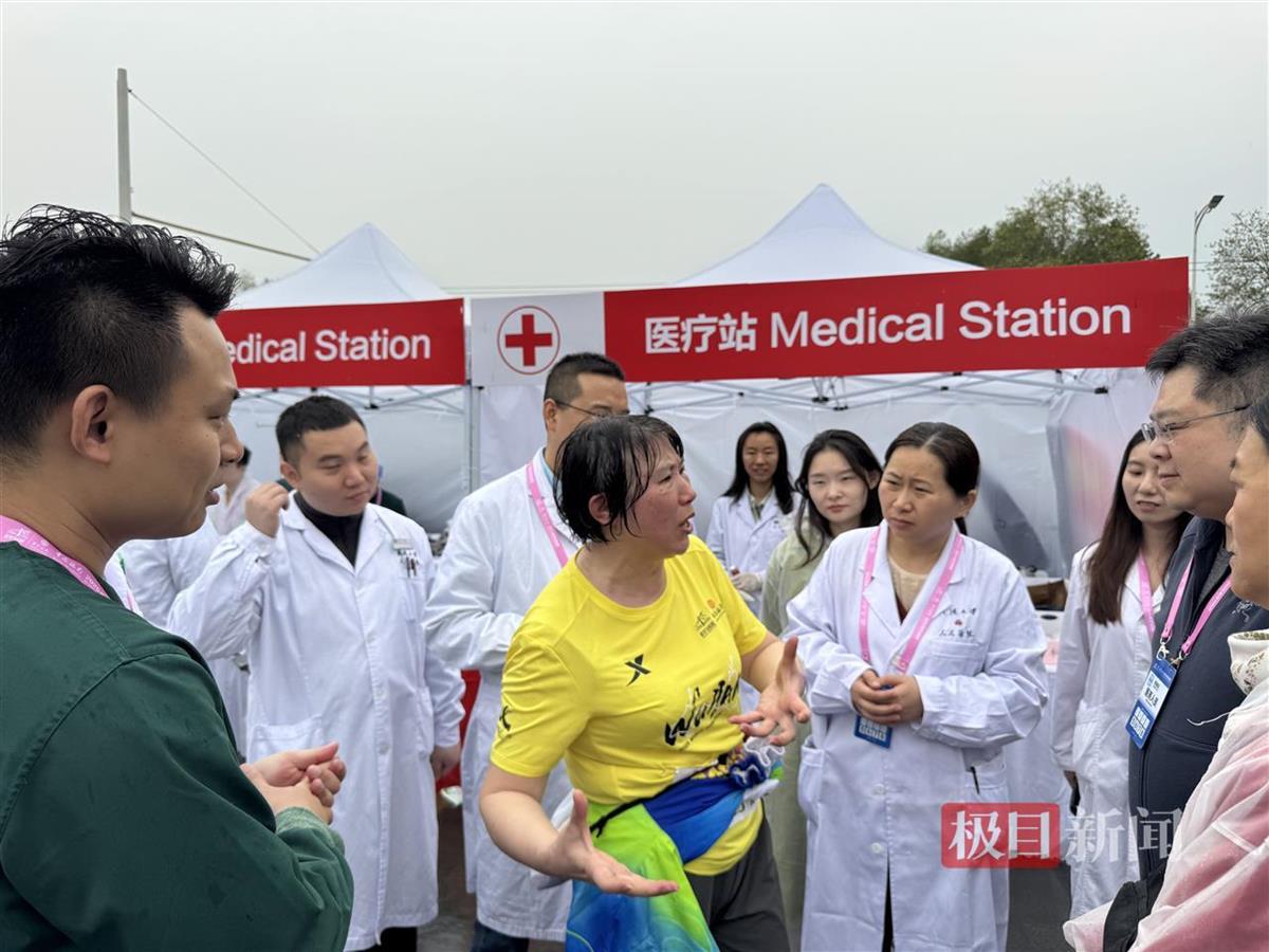 除了詹丽英教授,人民医院的医护跑团也在一路护航着汉马健儿们:儿科医生陈江南完成全马,途中为抽筋跑友提供现场指导;麻醉科护师徐勇、医学工程师袁加国化身“移动急救员”,随身携带急救物资陪跑全马;肿瘤科阮莎莎教授作为本次汉马的官方“急救跑者”,与医疗站全程联动。