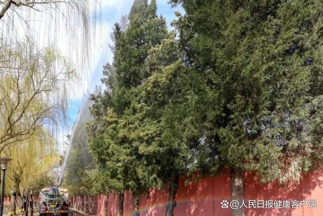 北京采用洒水喷淋、地面湿化等措施减少以圆柏等树木为主的花粉飘散量。“首都园林绿化”微信公众号 图