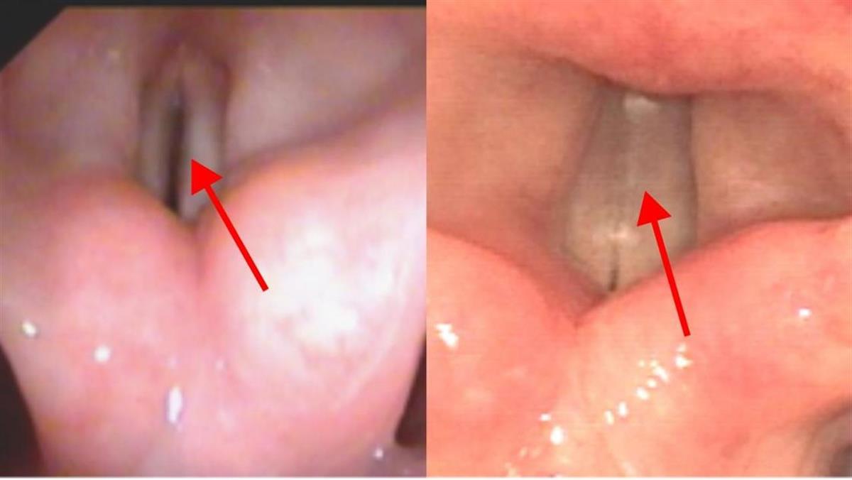 手术喉镜影像(发“一”音时声门):左边术前,声门关闭不全,遗留缝隙;右边术后1个月,声门闭合良好 (通讯员供图)