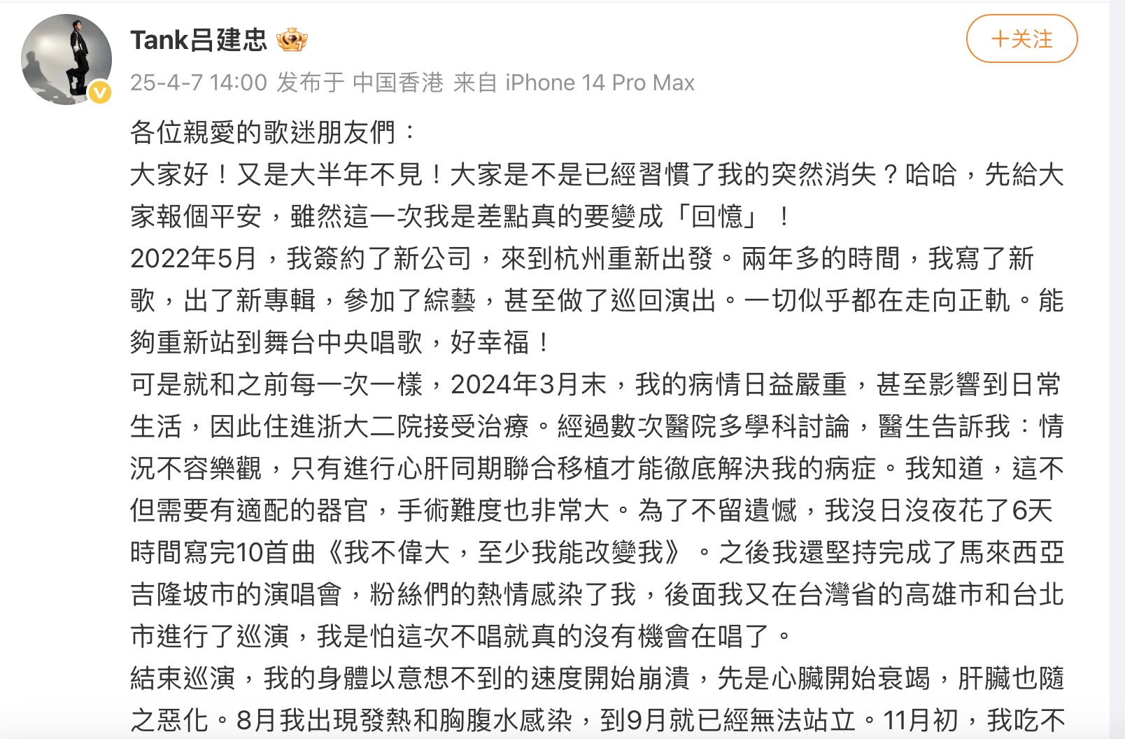 4月7日,浙江大学医学院附属第二医院宣布知名歌手TANK在医院完成心肝同期联合移植手术,顺利出院。同日,TANK也在自己的社交媒体账号发文介绍了就医的过程。