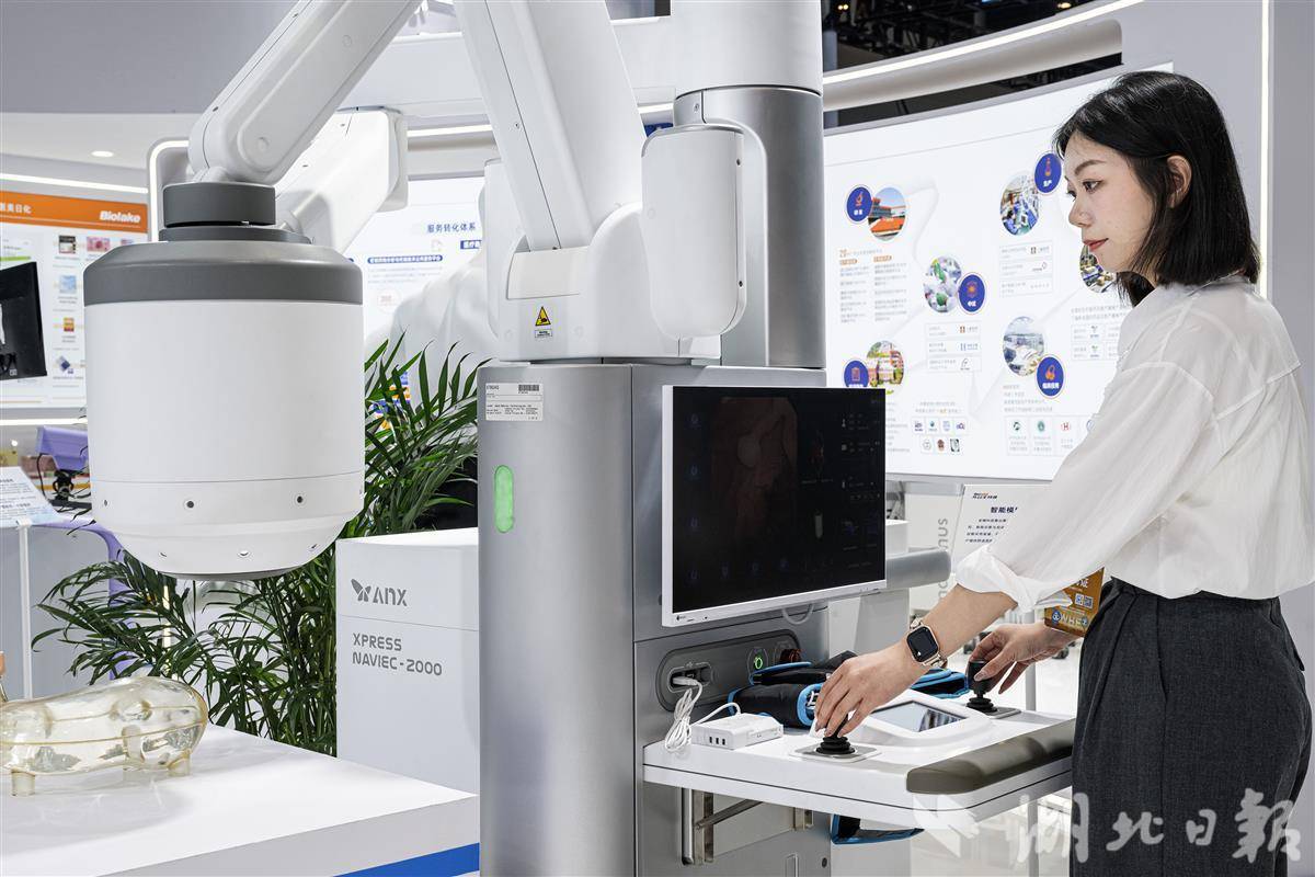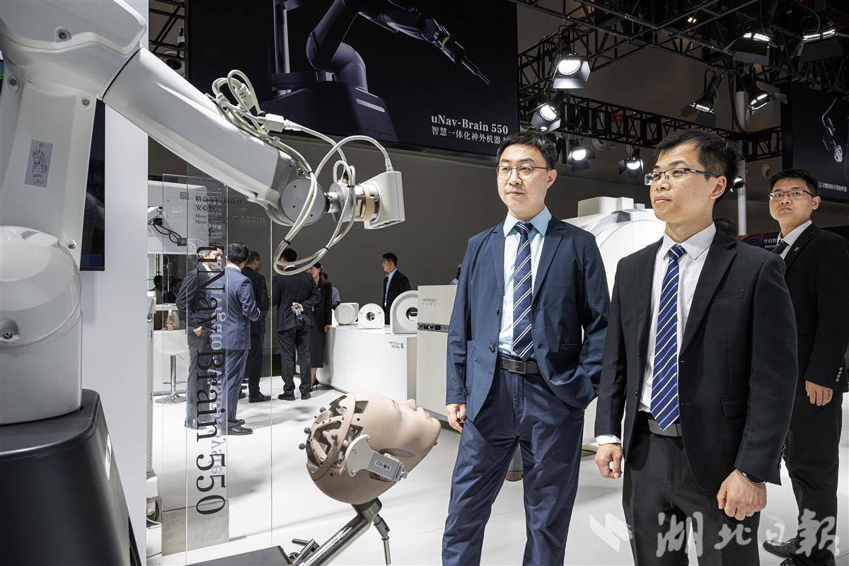 4月8日,在本届健博会主会场武汉光谷科技会展中心,联影展台展示的智慧一体化神经外科手术机器人吸引与会嘉宾驻足。(湖北日报全媒记者任勇摄)