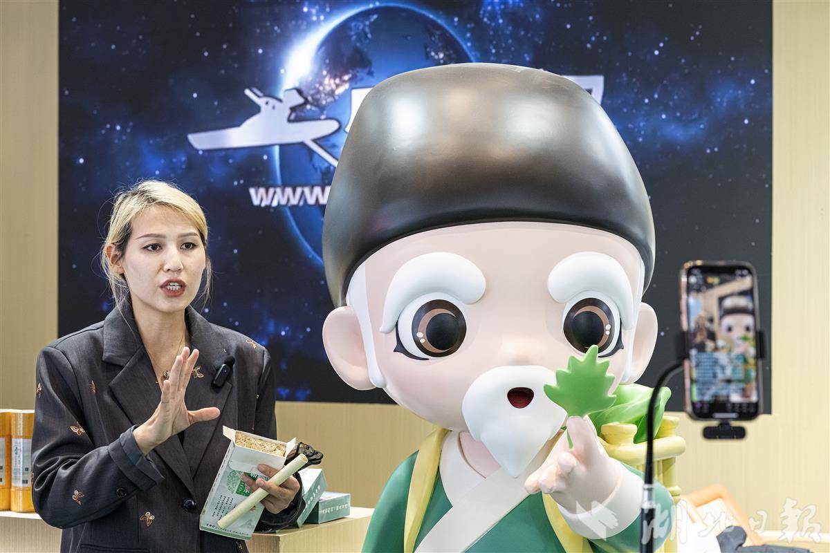 4月8日,在本届健博会主会场武汉光谷科技会展中心,“十大楚药”展台的工作人员直播讲解产品。(湖北日报全媒记者任勇摄)