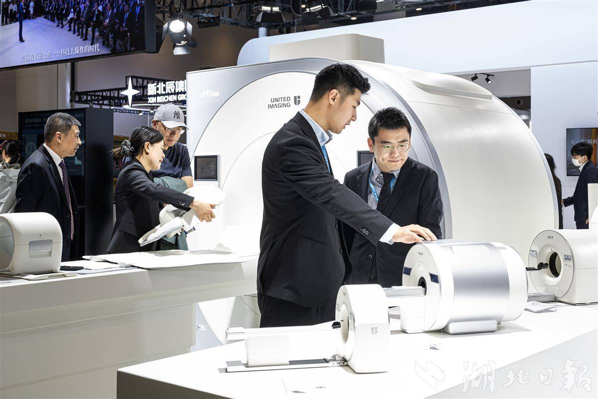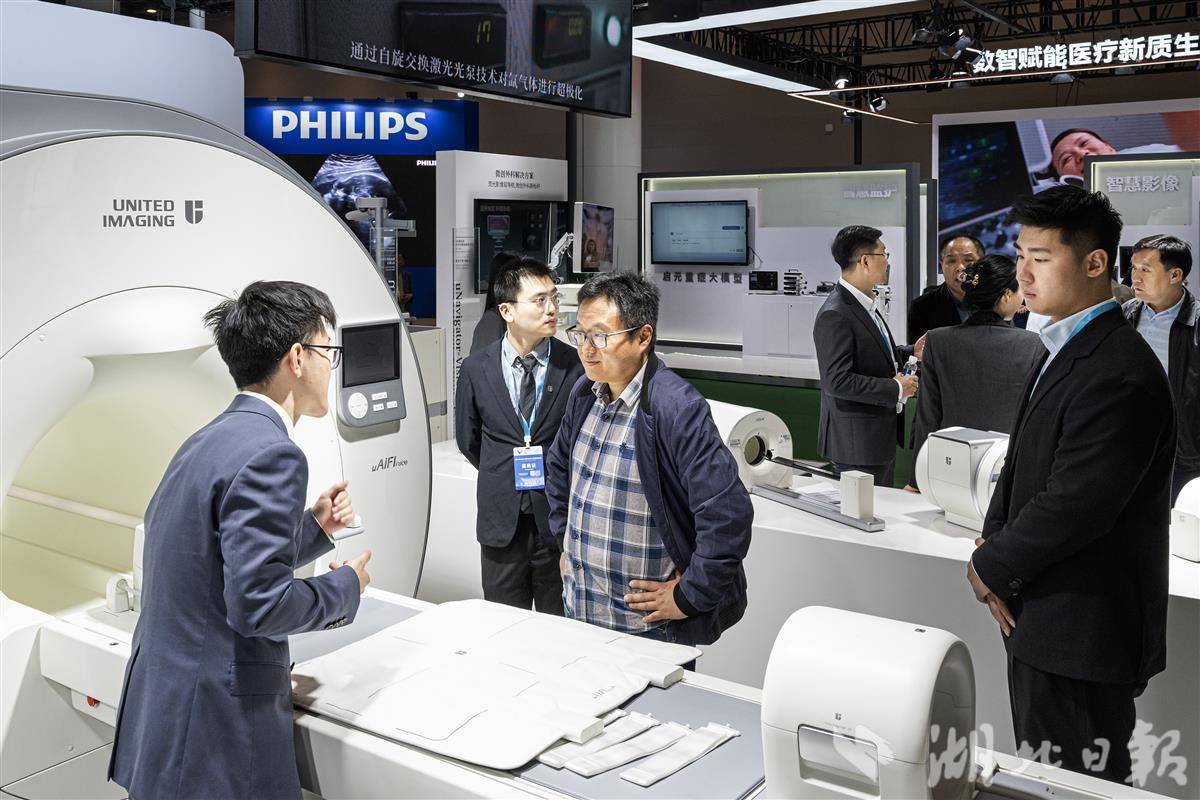 4月8日,在本届健博会主会场武汉光谷科技会展中心,联影展台展示的医疗器械吸引与会嘉宾驻足。(湖北日报全媒记者任勇摄)
