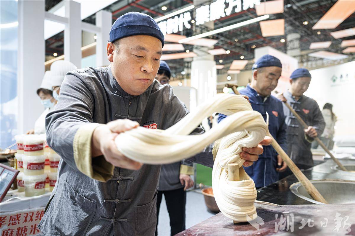 4月8日,在本届健博会主会场武汉光谷科技会展中心,孝感展台的工作人员展示手工制作孝感麻糖。(湖北日报全媒记者任勇摄)
