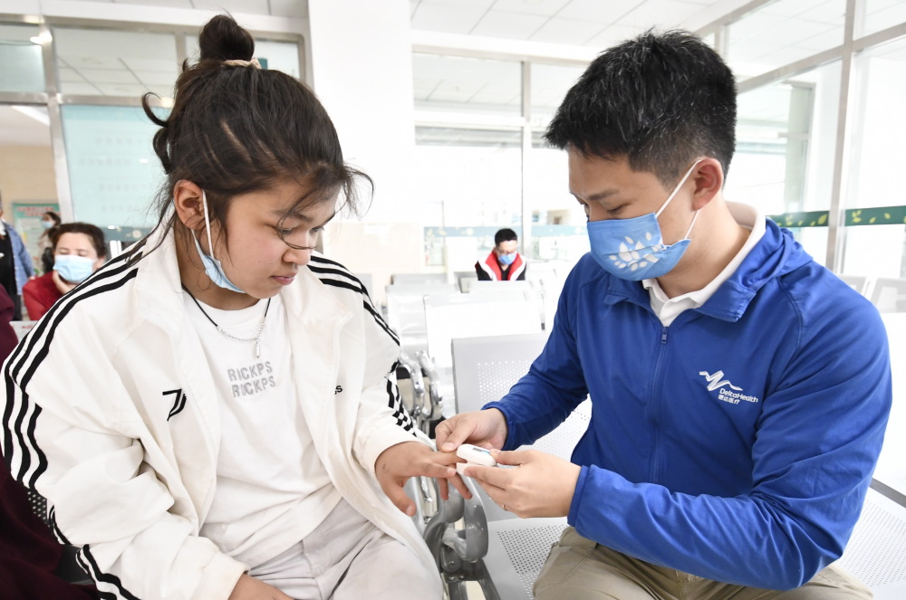 4月8日,参加筛查活动的上海德达心血管医院的志愿者朱佐牧(右)在巴楚县为待筛查儿童测量血氧。新华社记者 李欣 摄