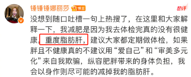 近日,艺人“锤娜丽莎”在微博发文表示,自己因重度脂肪肝开始减肥。从她发的照片来看,目前减肥成效初显。