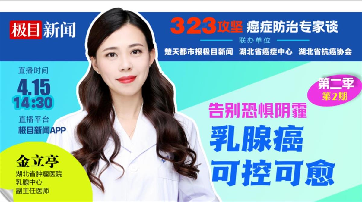 4月15日下午,湖北省肿瘤医院乳腺中心副主任医师金立亭,将做客“323攻坚-癌症防治专家谈(第二季)”的第二场直播。金立亭从事乳腺肿瘤工作10余年,在乳腺癌综合治疗及各类型乳腺手术方面积累了丰富的经验,擅长乳腺各类肿瘤的诊治、乳腺癌的诊断及综合治疗、乳腺微创手术、保乳手术、乳房重建手术等。她将为广大女同胞科普乳腺癌防治话题,消除关于乳腺癌的诸多认知误区。