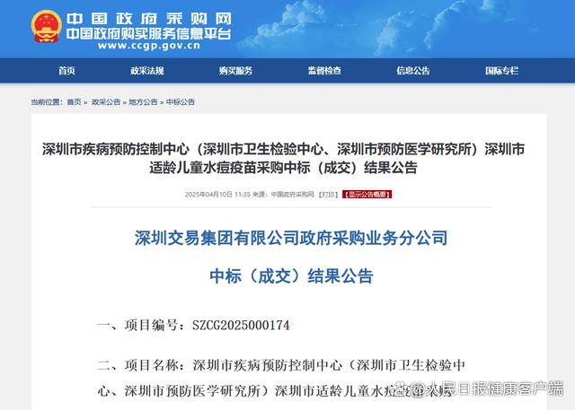 (人民日报健康客户端记者 刘诗霞 朱晓娜)4月10日,据中国政府采购网消息,深圳市疾病预防控制中心公布,深圳市适龄儿童水痘疫苗采购中标(成交)结果,公告显示,北京民海生物科技有限公司以25元/支的价格中标。对比2024年7月浙江省公布的60元/支的水痘疫苗中标价格,其降幅达58.33%。