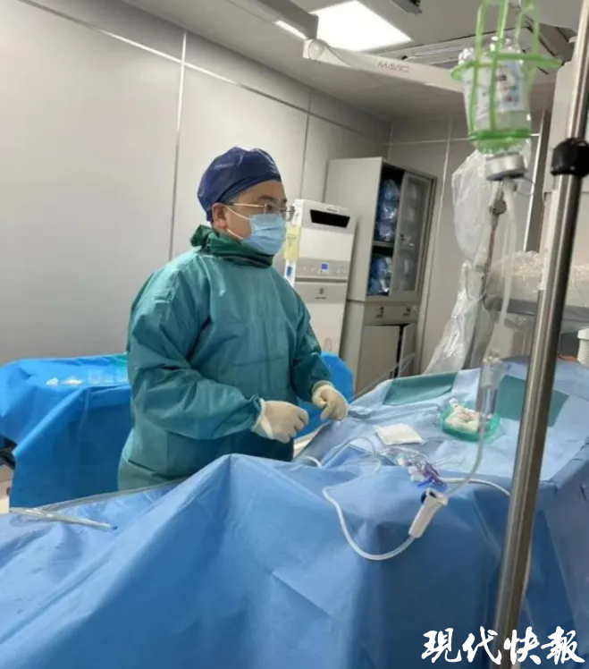 手术过程中,耿海华团队通过冠状动脉造影发现,患者的左前降支血管呈完全闭塞状态,而该血管是负责为心肌提供50%以上血液供应的关键血管,一旦受到影响,左心大部分心肌都会缺血。针对此情况,耿海华首先使用扩张球囊对闭塞部位进行扩张,随后发现闭塞部位存在约3cm的较大血栓。由于血栓位置靠近左主干,在进行血栓抽吸操作时,存在血栓脱落并回流至左主干或回旋支,进而引发严重并发症的风险。因此,决定先使用药物(替奈普酶)进行溶栓治疗。