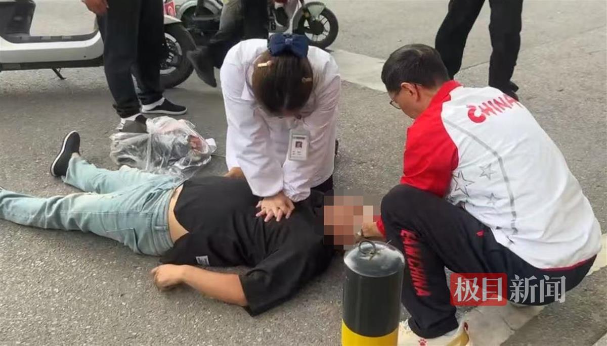 徐丽佳立即跪地为外卖小哥实施心肺复苏,同时大声呼喊路人及一旁学生拨打120。此时,一位热心爹爹主动上前协助,徐丽佳一边进行胸外按压,一边指导他将外卖小哥头偏向一侧,并帮忙清理口鼻分泌物,畅通气道。徐丽佳还请学生叫来正在附近招募献血的同事一同帮忙,大家齐心协力,与死神展开了一场争分夺秒的较量。