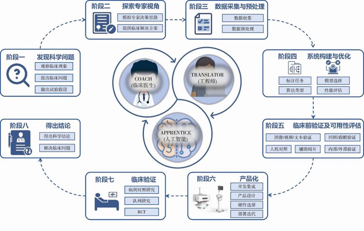 “教练理论”将AI开发细致地划分为8大阶段,涵盖从科学问题发现、专家视角探索、数据采集,到产品化、临床验证等各个关键步骤,且在整个过程中高度强调医工深度协同。