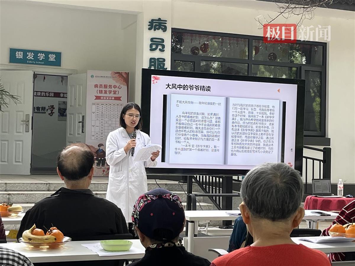 4月22日下午,在第30个世界读书日来临之际,武汉市东湖医院银发学堂外,住院老人们在医护人员陪伴下开展世界读书日主题活动。