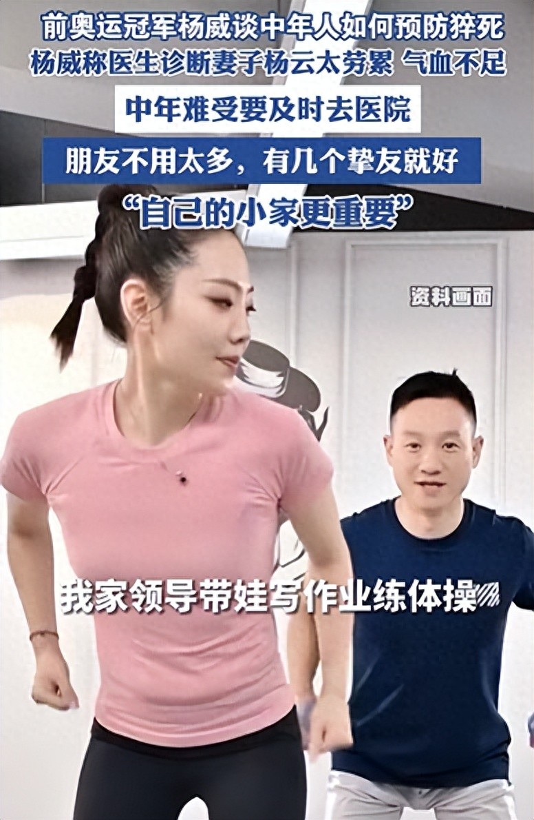 4月24日,奥运冠军杨威发视频惋惜今年猝死的人特别多,称妻子杨云太劳累、气血不足。