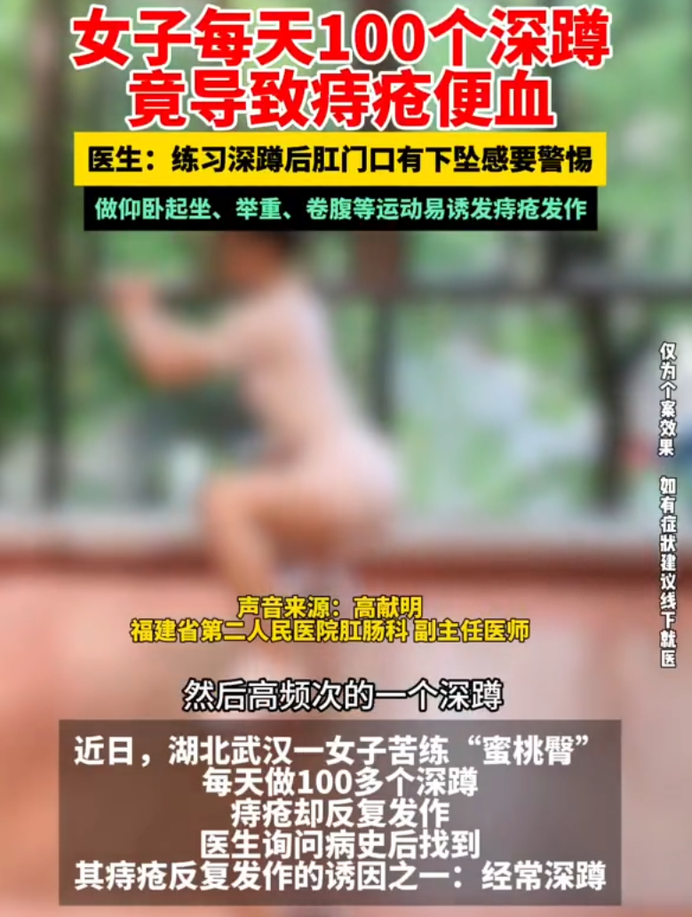 近日,湖北武汉一女子苦练“蜜桃臀”,每天做100多个深蹲,痔疮却反复发作。