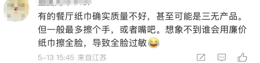 钟医生说,用完劣质纸巾后的接触性皮炎一般都是轻症,目前接诊过相对比较严重的是个小伙子,“当时他嘴巴一圈都是红肿发痒的,症状发生前在小餐馆里吃过饭,用纸巾擦完后就开始痒了。”