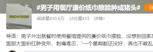 近日,安徽一男子外出就餐时使用餐馆提供的廉价纸巾擦脸,没想到回家后脸部出现严重过敏反应,导致面部大面积红肿变形、刺痛难忍。