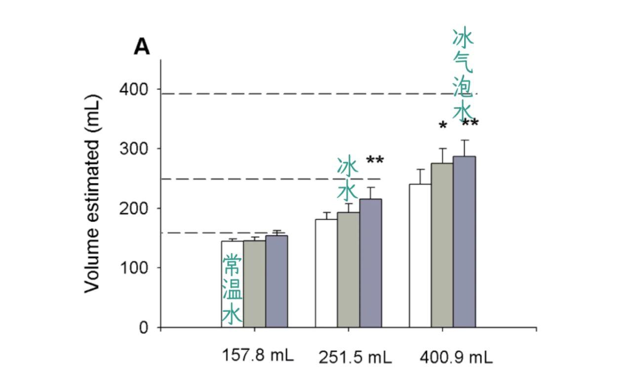 研究人员让受试者们使用吸管杯喝饮料,并且不能用手拿水杯,然后让受试者预估自己喝了多少饮料。结果显示,喝冰气泡水的人预估的比常温水多22%。