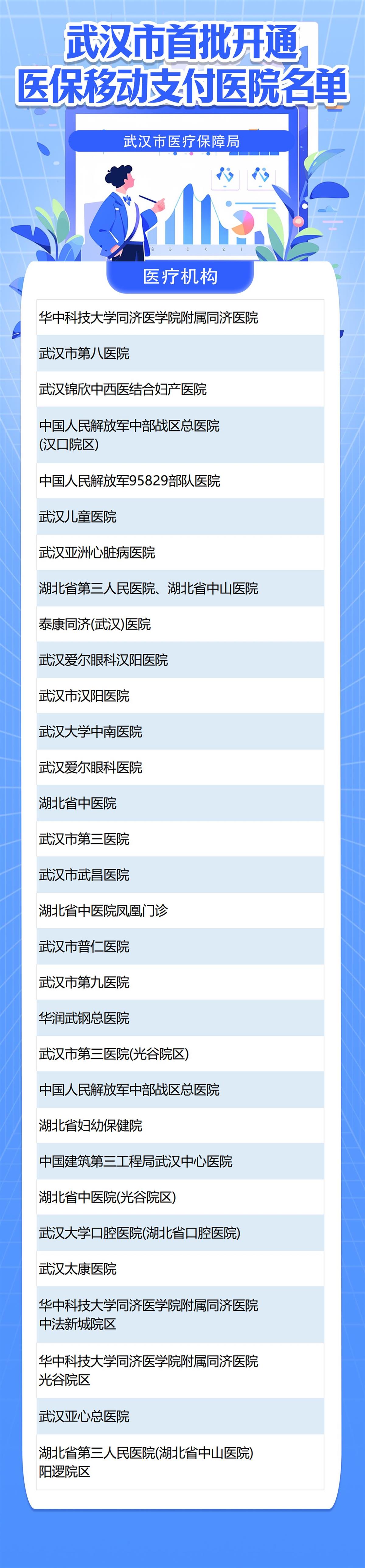 此次,武汉首批31家医院上线医保移动支付,武汉市职工(在职和退休)、居民、已完成异地就医备案的其他省市参保群众,前往这些开通医保移动支付的医院就医时,只需要一部手机,就能轻松完成医保结算。医保移动支付的费用主要包括检查费、治疗费、药费等门诊费用,部分医院可支持住院费用医保移动支付。