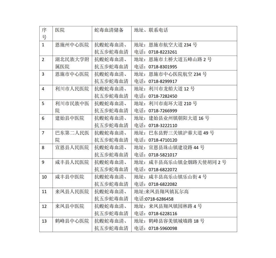 恩施州可以打抗蛇毒血清的(部分)医院名录(以各医院实际情况为准)
