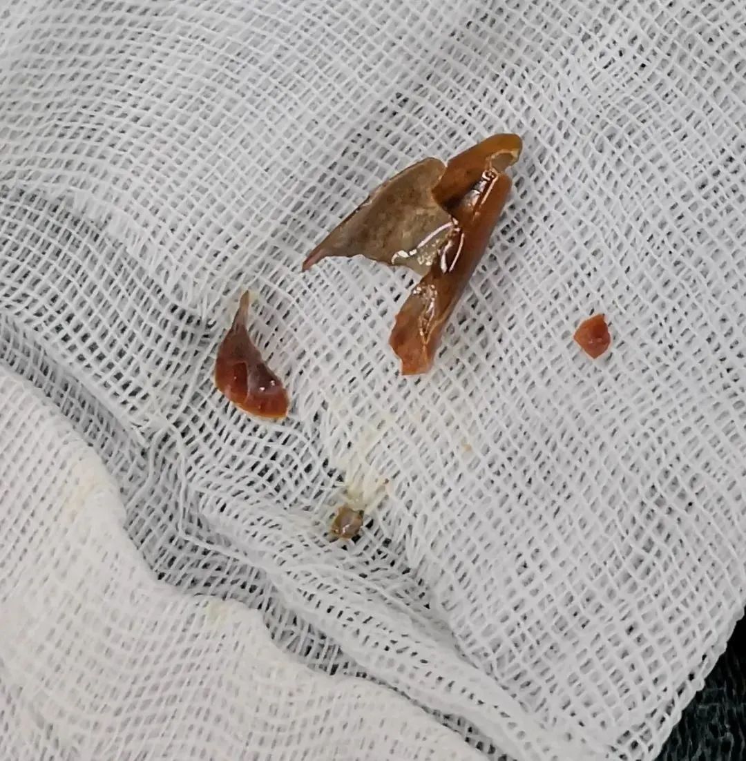在镜下操作时,李森华果然发现一处新生肉芽组织包裹的异物,取出后竟看到了半截辣椒皮!