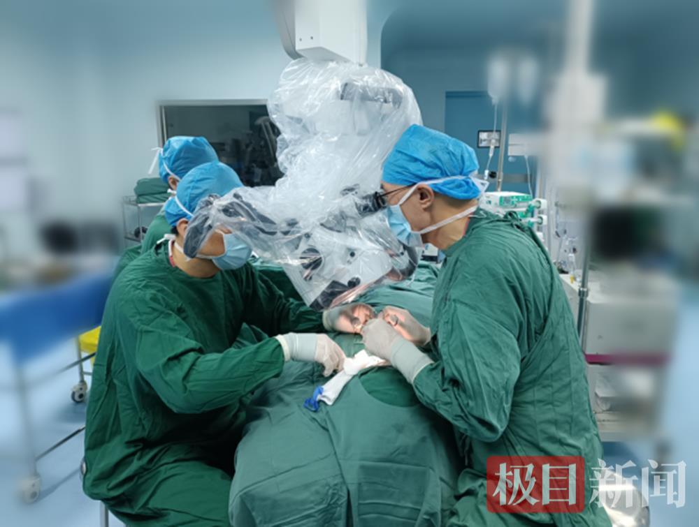 手术中,神经外科一病区岑波教授带领手术团队在高倍显微镜的辅助下,以“绣花针”般的细腻操作巧妙避开血管分支与神经束,成功完成手术。