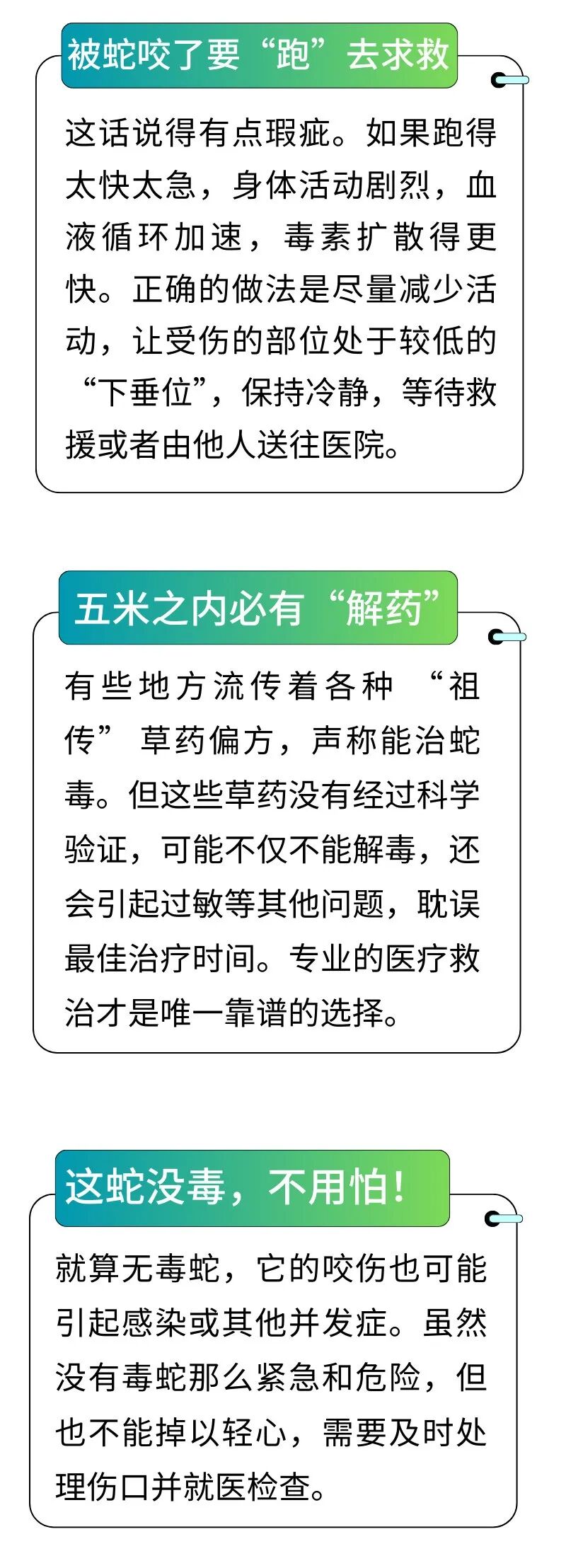 ⚠️重要提醒:掌握科学的自救方法,能为被蛇咬伤后的救治争取宝贵时间,具体就是做好三个“尽快+尽量”,避免加速毒素扩散。①被蛇咬伤后,尽快拨打急救电话,告知具体位置及咬伤情况。取下手表、袖套、鞋子等紧身衣物,避免肢体肿胀后无法取下造成二次伤害。尽量采取坐姿或躺姿,减少自主活动,降低体力消耗。