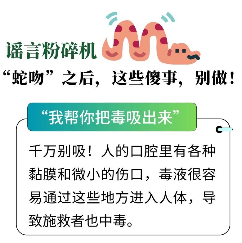 ②尽快用流动清水、肥皂水或盐水冲洗伤口表面,边冲洗边由近心端往伤口挤出血液,以减少残留在体表的毒素含量。如伤口残留有毒牙,应及时挑出。尽量记住蛇的样子,条件允许时可以拍下蛇的图片,便于送医后交专业人士辨识。③如果伤口较深、出血明显,尽快用绳子、布条、止血带或其他系带绑扎伤口的近心端,可延缓毒液进入体内。每隔30分钟左右松解一次,每次松开2-3分钟。尽量寻找木板或木棍固定被咬伤患肢,让受伤部位相对处于心脏水平以下,保持低位状态。有条件的可用冰袋或冷毛巾敷在伤口上方(近心端),但需避免直接接触皮肤以防冻伤。⚠️注意:切勿为取证强行捕捉或靠近毒蛇,严禁用嘴吸取毒液(可能导致施救者中毒)、不可切开伤口(可能加重伤口感染)。
