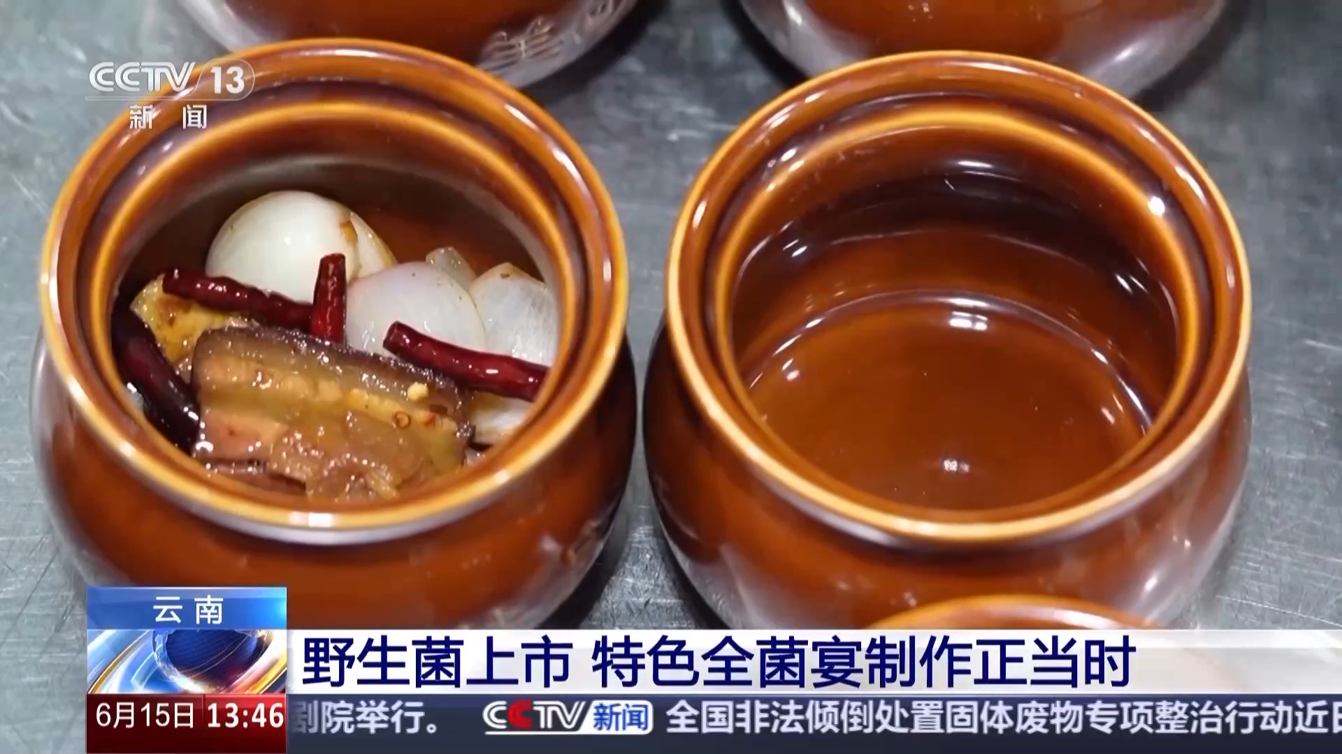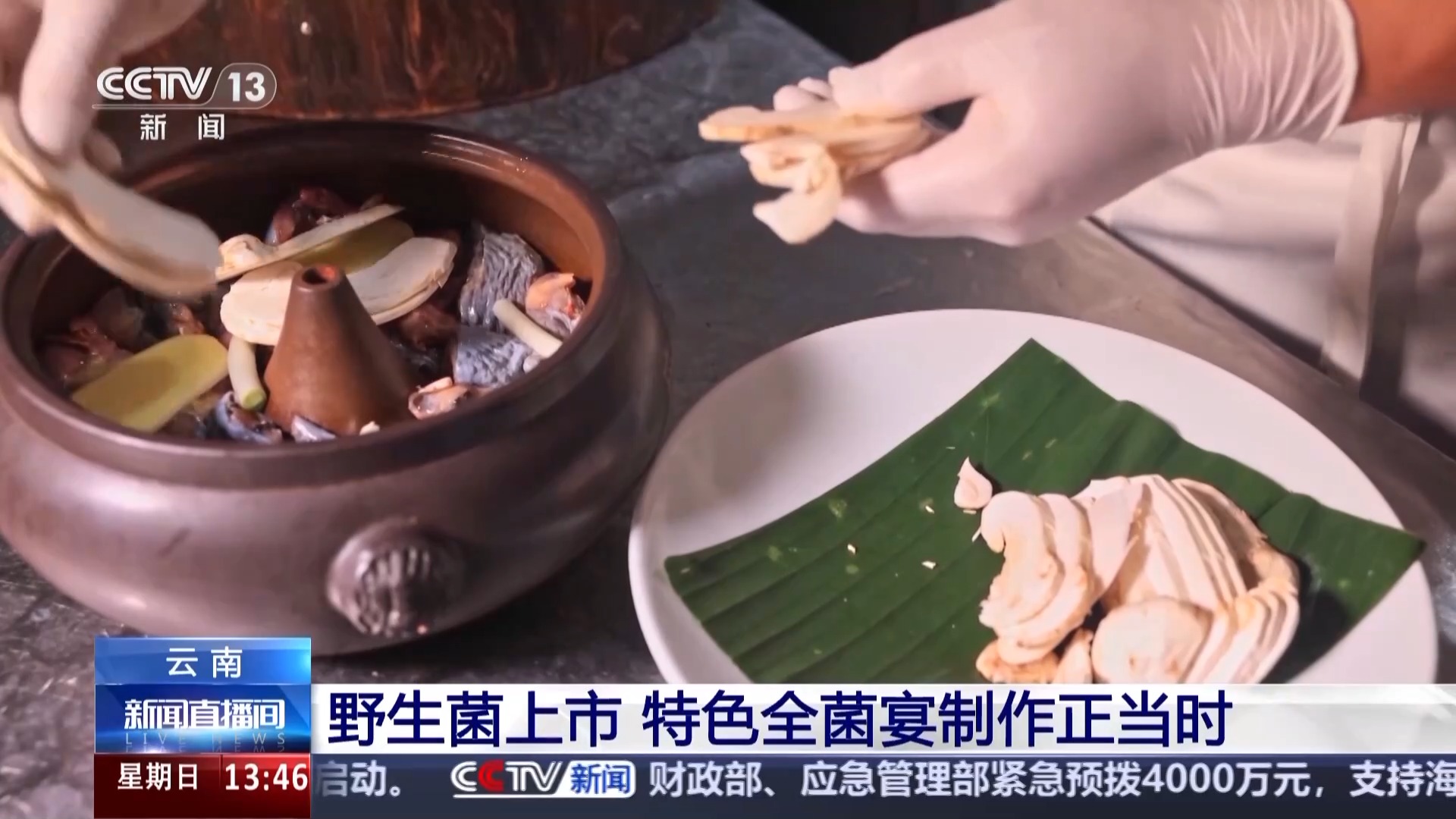 餐饮店负责人 陆瑜:这一道菜,里面大有来头,它里面可以包各种各样的野生菌,今天包的是菌中之王——鸡枞,(一共)10种菌子做成了12道野生菌宴,再过半个月以后,我们云南多元素的所有的野生菌都大量上市,那么在暑假的时候,大家来到美丽的春城,一定能享受到更加美味更加丰富的野生菌特色。