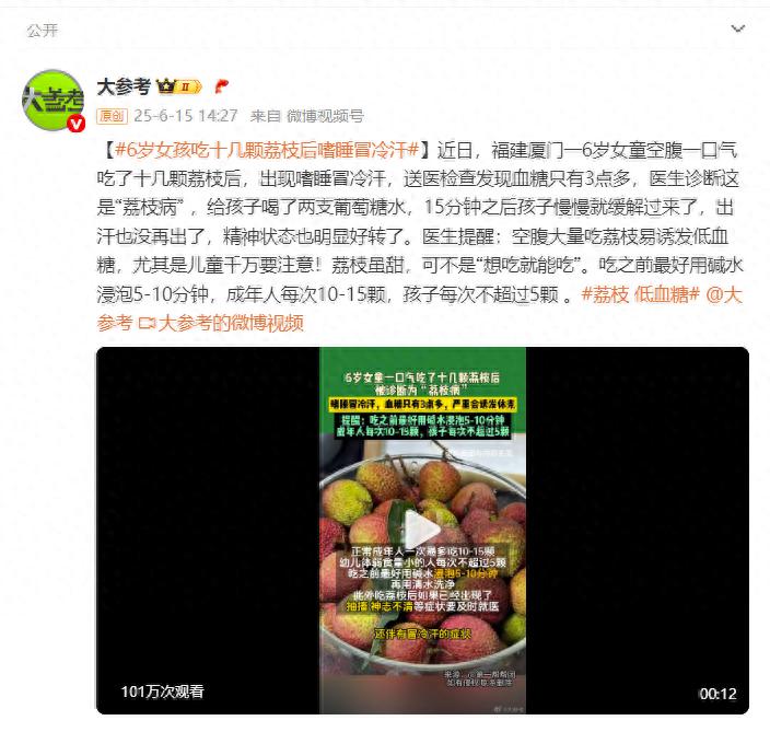 近日,福建厦门一6岁女童空腹一口气吃了十几颗荔枝后,出现嗜睡冒冷汗,送医检查发现血糖只有3点多,医生诊断这是“荔枝病” ,给孩子喝了两支葡萄糖水,15分钟之后孩子慢慢就缓解过来了,出汗也没再出了,精神状态也明显好转了。