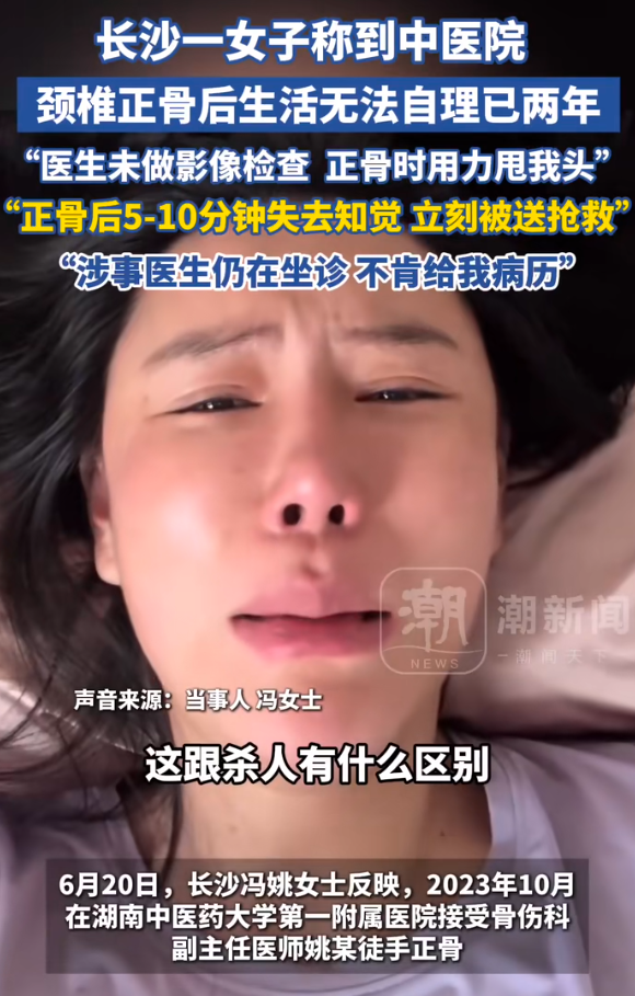 “我基本不能像一个正常人那样生活。”2025年6月17日,潮新闻记者联系到长沙市民冯姚。她表示,2023年在湖南中医药大学第一附属医院(以下简称“湖南中医附一院”)颈部正骨导致颈椎损伤,事发近2年时间,她的身体状况不仅没有恢复得很好,也因无法获得就诊病历导致未能进一步维权等。