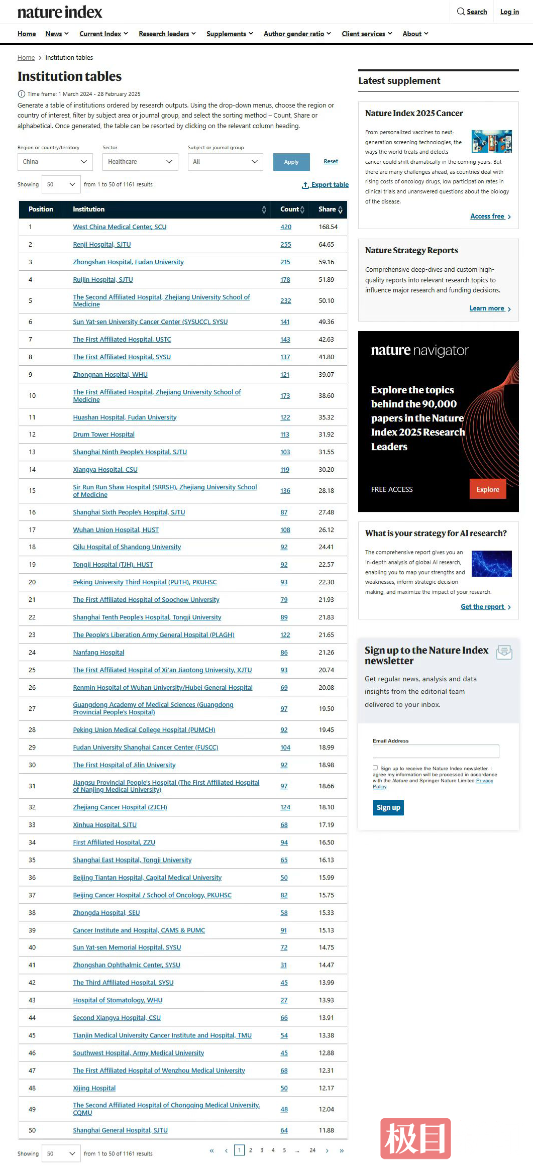 近日,国际顶尖期刊《自然》杂志网站公布了最新自然指数排名(2024年3月1日至2025年2月28日),武汉大学中南医院位列中国医疗机构第9位、湖北地区首位,再创该院历史新高。另外,湖北还有四家医疗机构跻身全国医院TOP50。