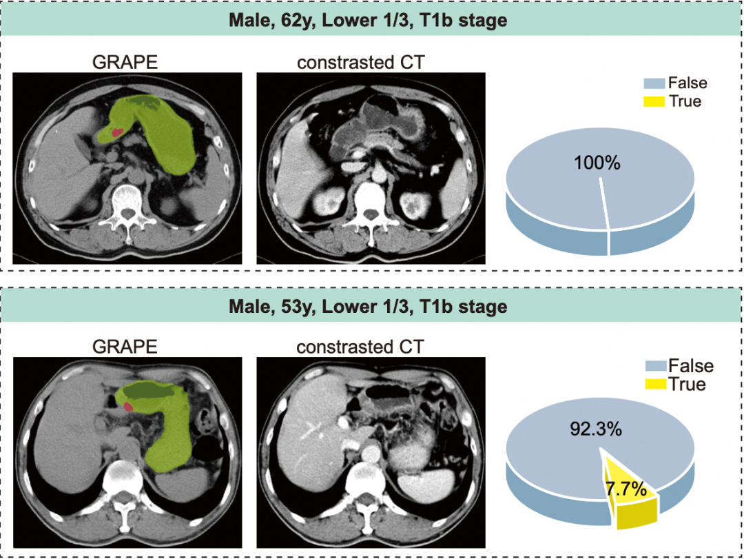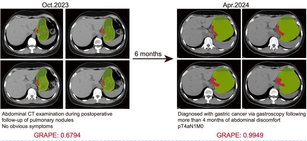 论文第一作者、浙江省肿瘤医院胃外科博士胡灿介绍,DAMO GRAPE模型有望填补在影像检查中机会性发现早期胃癌的空白。本次研究中,团队就对11名患者确诊胃癌前的CT影像进行回顾性分析,发现AI模型可提前2到10个月发现胃癌。例如,其中1名45岁患者因腹部不适接受胃镜检查,确诊局部晚期胃癌,而该患者6个月前因其他疾病做过胸腹部平扫CT检查,当时腹部未报告有病变。胡灿将片子导入AI模型,提示存在胃癌病灶。也就是说,如果6个月前就有AI自动监测,这名患者将在更早阶段确诊,不漏诊,另外可更早接受治疗。