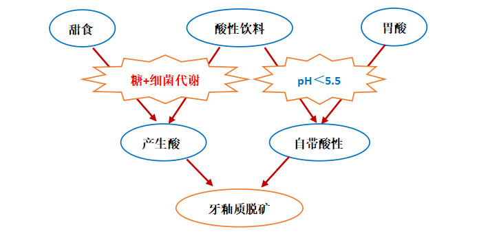 当口内pH值>5.5时,钙磷的沉积大于流失,釉质表面会重新修复;当口内pH值<5.5时,牙面钙磷流失速度大于再矿化速度,釉质表面会脱矿。pH值越低,釉质脱矿和溶解的程度就会越严重!