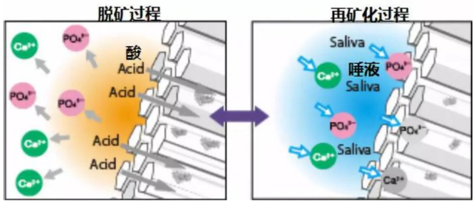 但是咱们口腔防御机制也不是吃素的,有一定的自我纠错和修复功能。牙齿长期浸泡在唾液里,唾液中含有大量的钙磷离子(且往往浓度高于牙面),可以随时往牙面上沉积,重新形成新的羟基磷灰石,弥补之前脱矿造成的钙磷损失,形成动态平衡。