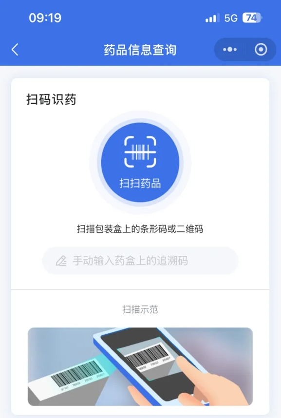 第二步:在“药品信息查询”页面,可扫描药品包装盒上的二维码或条形码进行查询。
