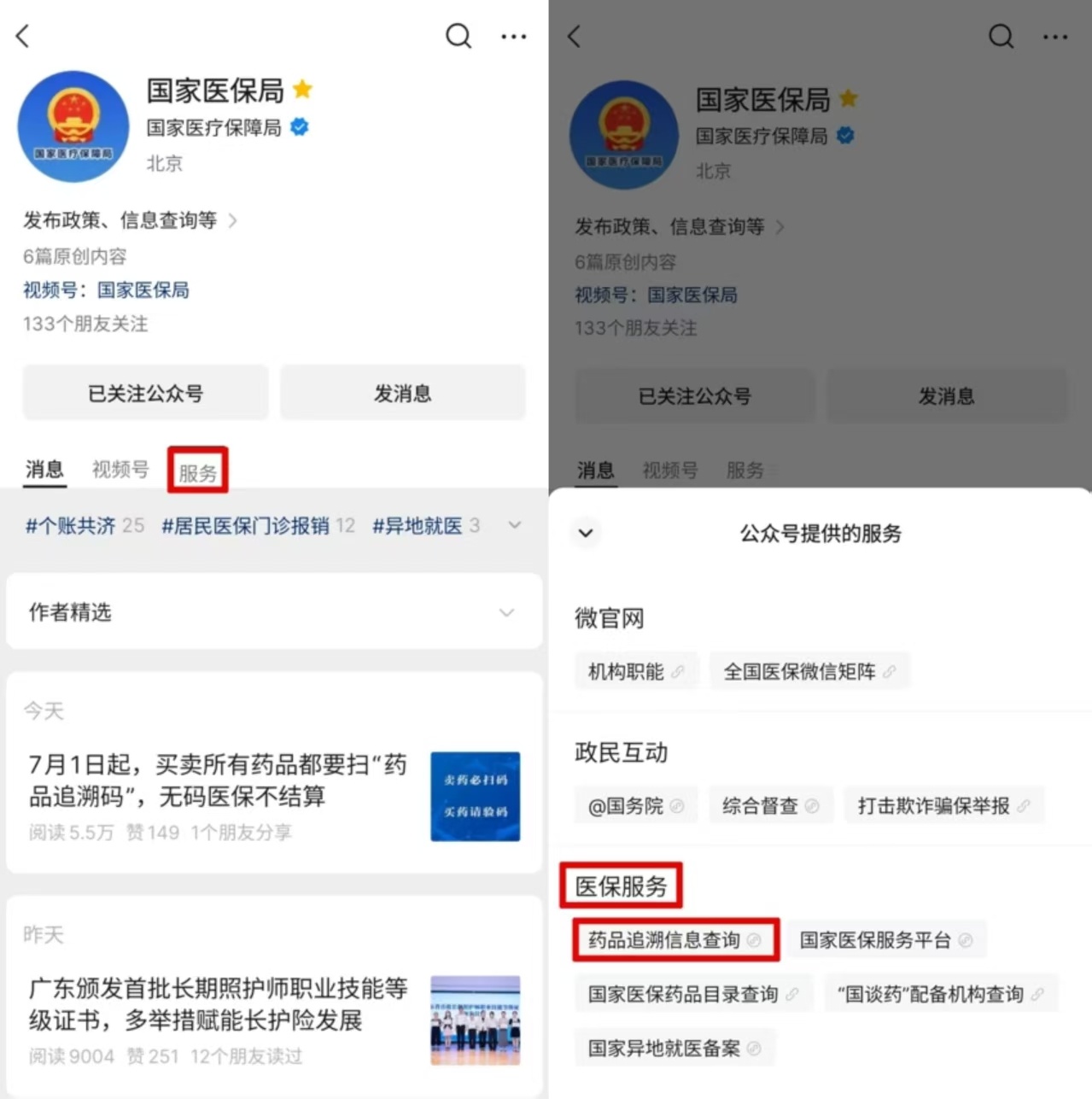 第一步:进入“国家医保局”微信公众号主页,点击服务→药品追溯信息查询,进入查询页面;