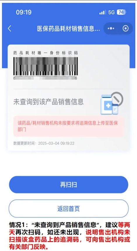 建议等两天再次扫码,如还未出现,说明售出机构未扫描该盒药品上的追溯码,可向售出机构或有关部门反映。