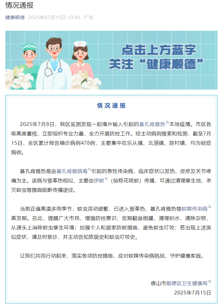 2025年7月8日,佛山市顺德区通报一起境外输入引起的基孔肯雅热本地疫情。截至通报发布,顺德全区累计报告确诊病例478例,主要集中在乐从镇、北滘镇、陈村镇,均为轻症病例。