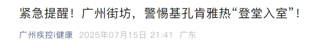 7月15日,佛山市顺德区通报一起境外输入引起的基孔肯雅热本地疫情。同日,广州市疾病预防控制中心通过微信公众号发布提醒,指广州存在基孔肯雅热的传播风险,请广州街坊们警惕这一疾病通过蚊子传播“登堂入室”;每一次清理家中积水,每一次喷洒驱蚊剂,每一次对孳生地的清理,都是对自身健康、家人安康和社区安全的坚实守护。