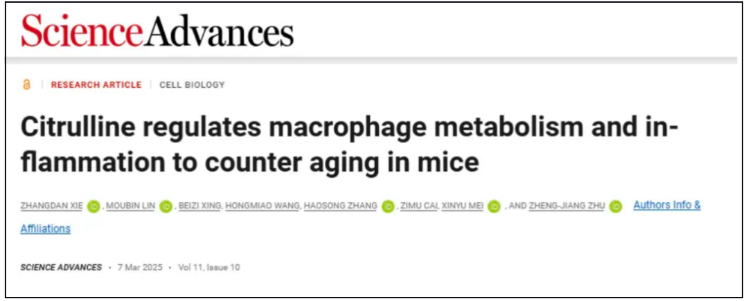 2025年3月,中国科学院朱正江团队在《科学进展》上发表的一项研究发现,瓜氨酸是一种与衰老相关的持续下调代谢物,补充瓜氨酸可以通过减少细胞衰老、防止DNA损伤、防止细胞周期停滞、调节巨噬细胞代谢和减轻炎症等,发挥抗衰老作用。