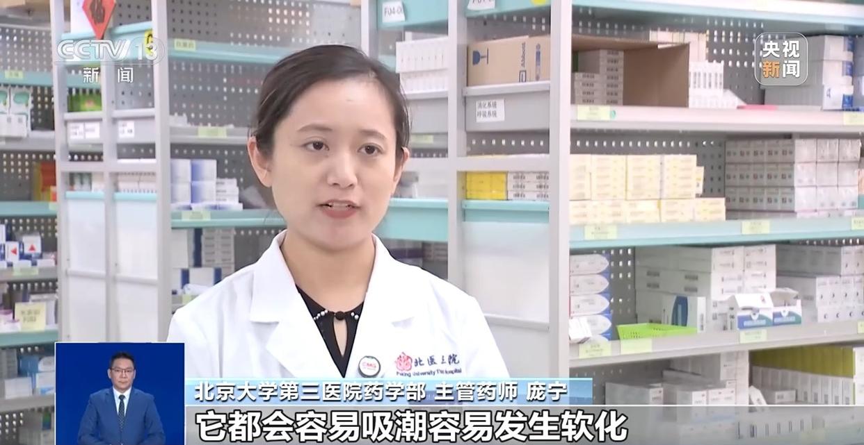 北京大学第三医院药学部 主管药师 庞宁:像常用的清咽滴丸,还有头孢克洛胶囊这样的胶丸剂及胶囊剂,都容易吸潮容易发生软化。因为胶囊的成分是明胶,这样的成分在温度比较高的时候容易发生药物的渗漏,发生泄漏和软化的情况。一般建议大家保存这类药物的时候,放在它原包装的一个锡纸当中,有效避免光照、避免见光分解、避免胶丸的融化。