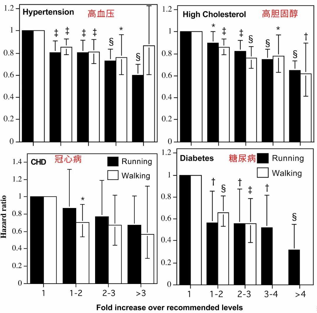 研究发现,每增加1MET(代谢当量)的能耗,跑步与走路在降低糖尿病和 CHD风险上没有显著差异,但是走路在降低高血压和高胆固醇血症风险上略高于跑步。