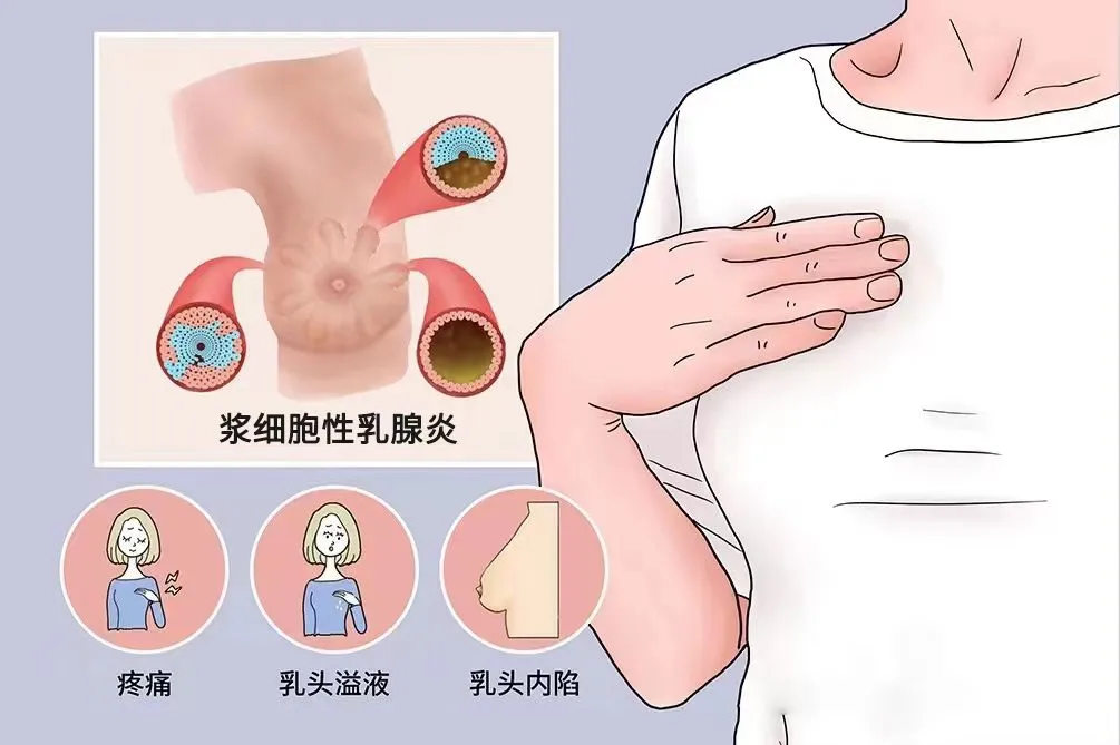 浆细胞性乳腺炎主要是由于乳腺导管内的脂肪性物质堆积,引起乳腺导管扩张,随着堆积物的分解,会引起导管周围的化学性刺激和免疫性反应,导致大量浆细胞浸润,故称浆细胞性乳腺炎。