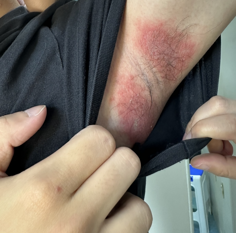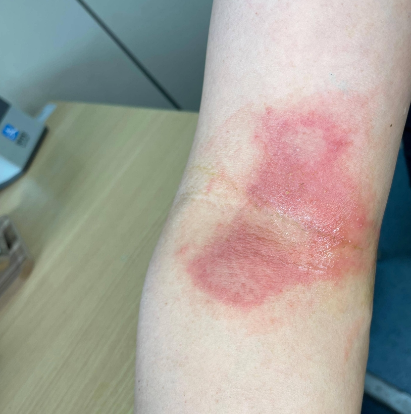 回家躺下后不久,小程就被胳膊上的灼痛感惊醒——原本只是小红点的地方,居然肿成了一片红斑,像被人用鞭子抽过似的,顺着胳膊肘蔓延到腋窝。他越抓越痒,越抓越痛,皮肤上甚至冒出密密麻麻的小水疱,破了的地方渗出透明液体。