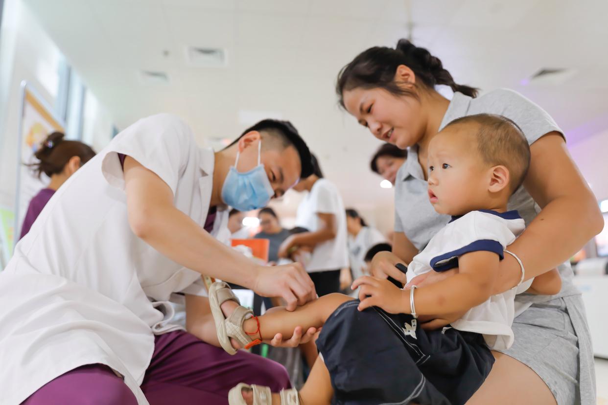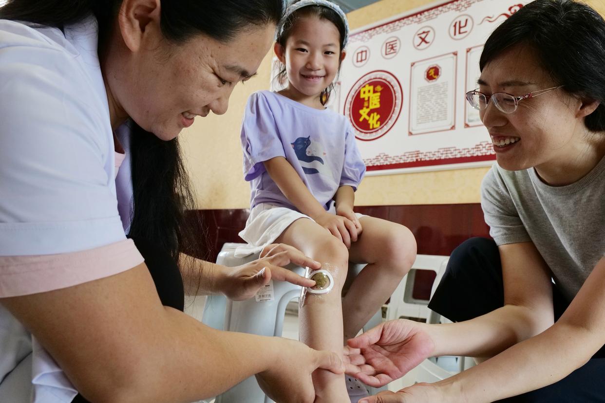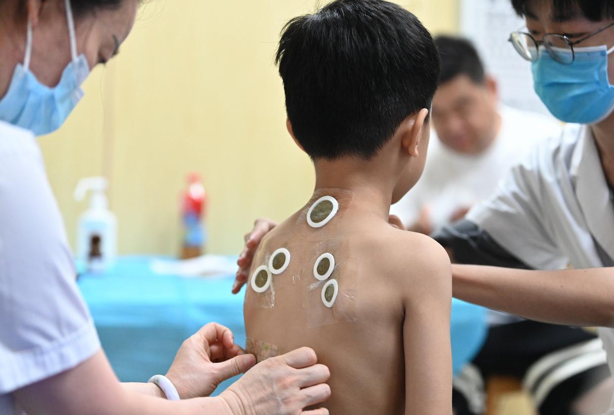 7月20日,在山东省枣庄市一家中医门诊,医务人员为小朋友贴“三伏贴”。新华社发(孙中喆 摄)
