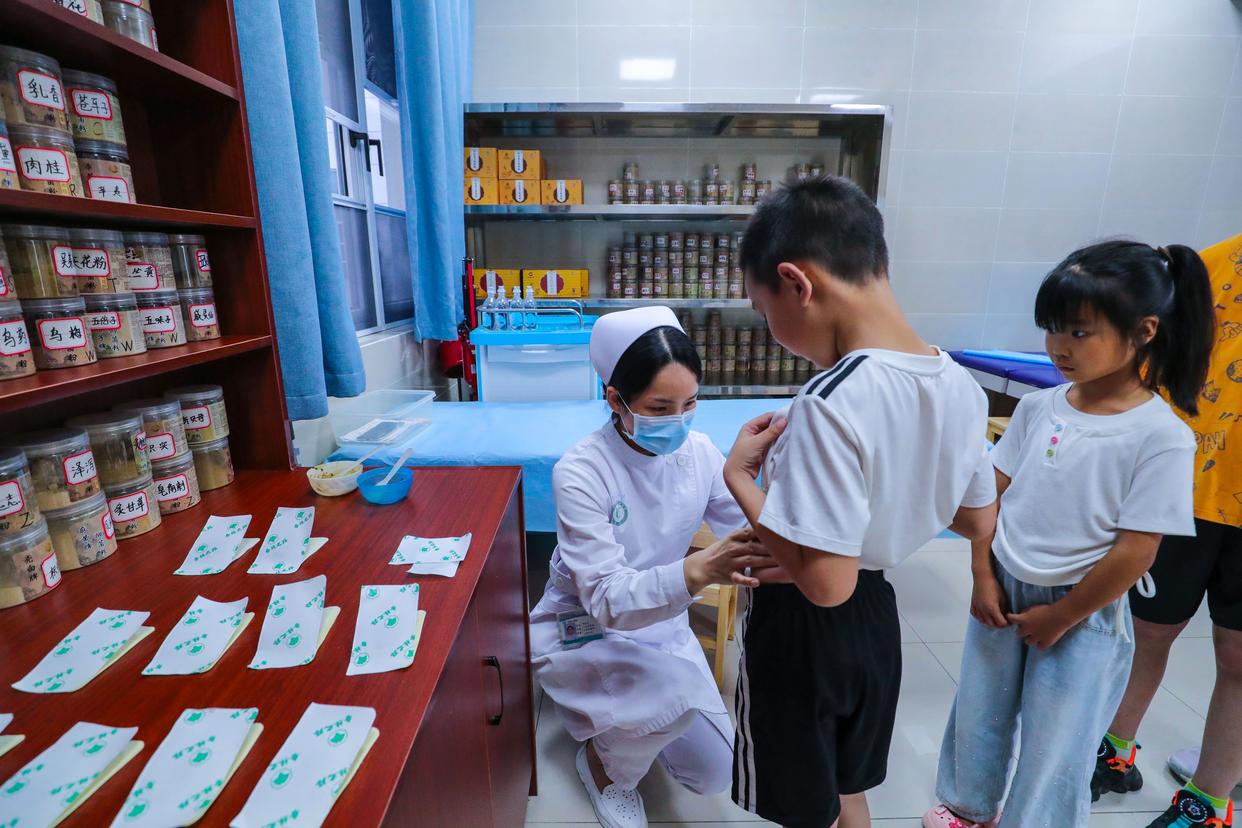 7月20日,山东省滕州市中医医院国医堂医务人员为小朋友贴“三伏贴”。新华社发(李志军 摄)