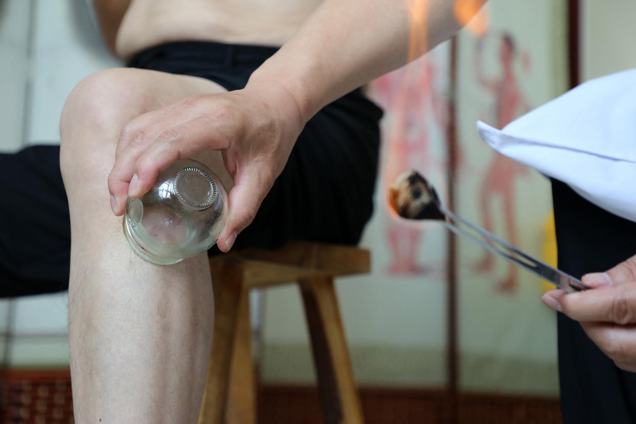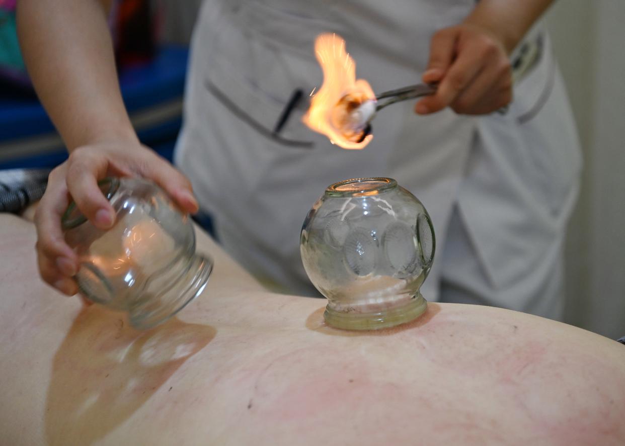 7月20日,在山东省滨州市博兴县中医医院,医务人员在给一名患者拔罐。 新华社发(陈彬 摄)