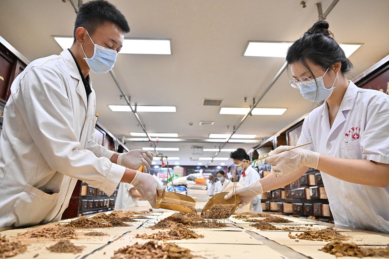 7月20日,在河南省商丘市中医院,中医师调配“三伏贴”所需中药。新华社发(李恒 摄)