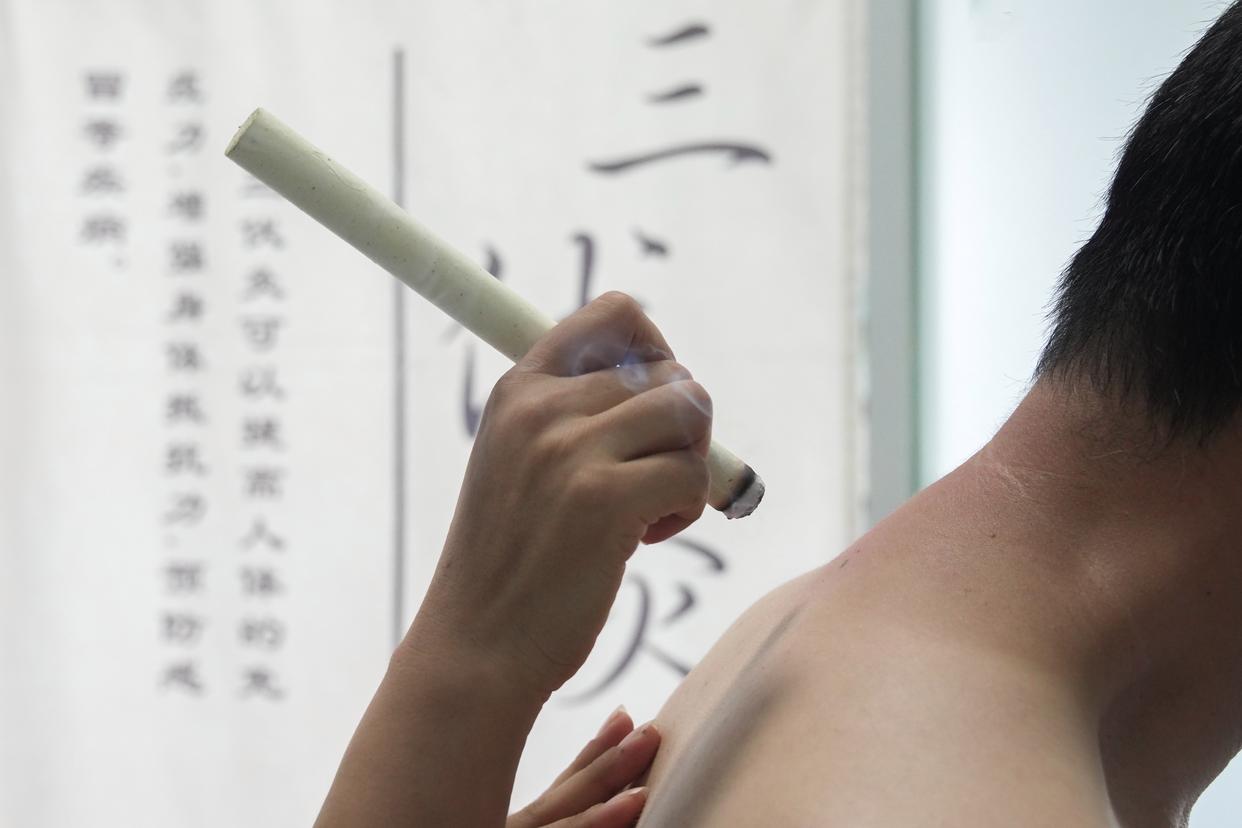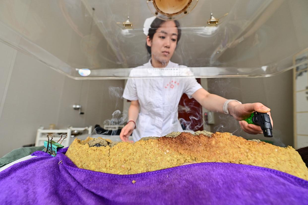 7月20日,医务人员在山东省淄博市高青县中医医院为患者做艾灸。新华社发(张维堂 摄)